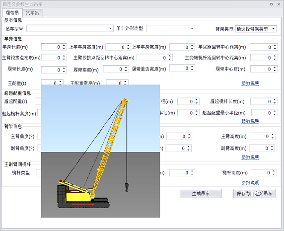 如果用户吊车不在系统的吊车库中,可以使用自定义功能,通过输入吊车外形参数来生成吊车模型,并可保存吊车参数为本地吊车库,方便以后重新使用相同型号的吊车。